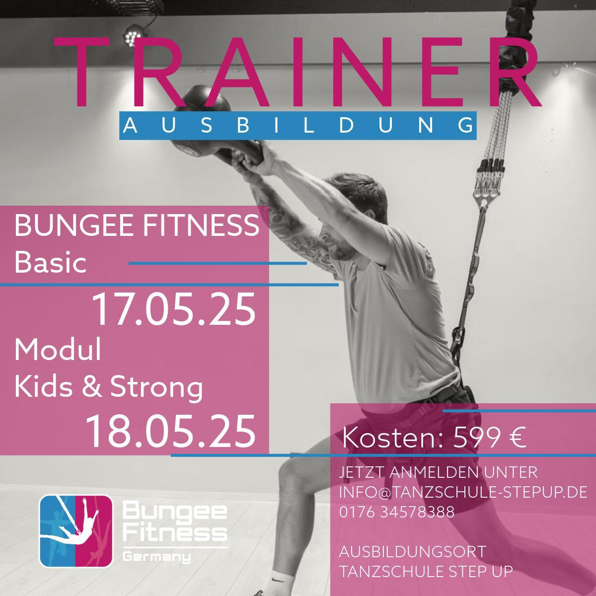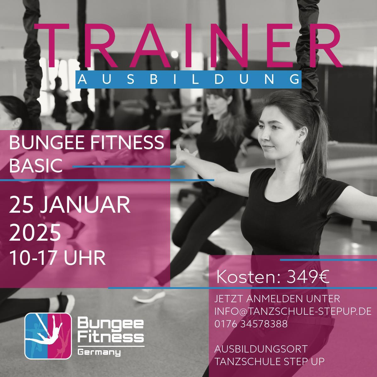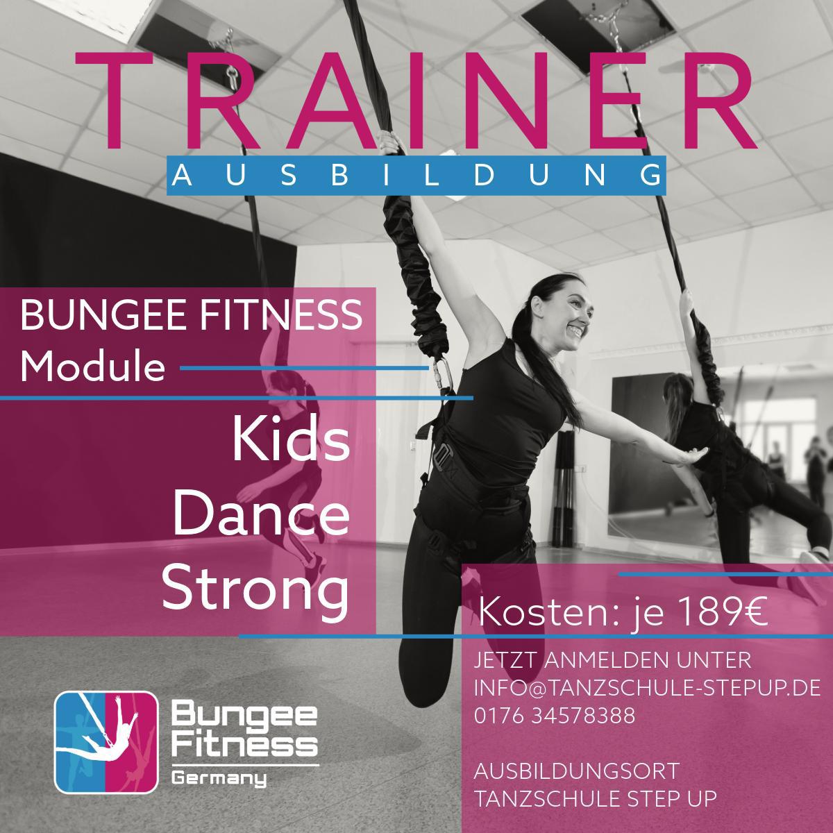 Endlich gibt es unsere Bungee Fitness Kurse als Aubildung. Die praxisnahe und individuelle Ausbildung zur/m zertifizierten Bungee Fitness Trainer/in qualifiziert Dich in Theorie und Praxis dazu, künftig Deine eigenen Bungee Fitness Kurse zu leiten. Erwirb in unserer Kompaktausbildung alle fachlichen und tänzerischen Grundlagen. Nach erfolgreich abgenommener Prüfung erhälst Du ein Trainerzertifikat. Nutze unser Kursprogramm, entwickle eigene Bungee-Choreographien und unterrichte demnächst auch in deinem Studio.